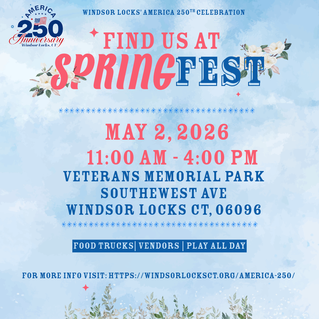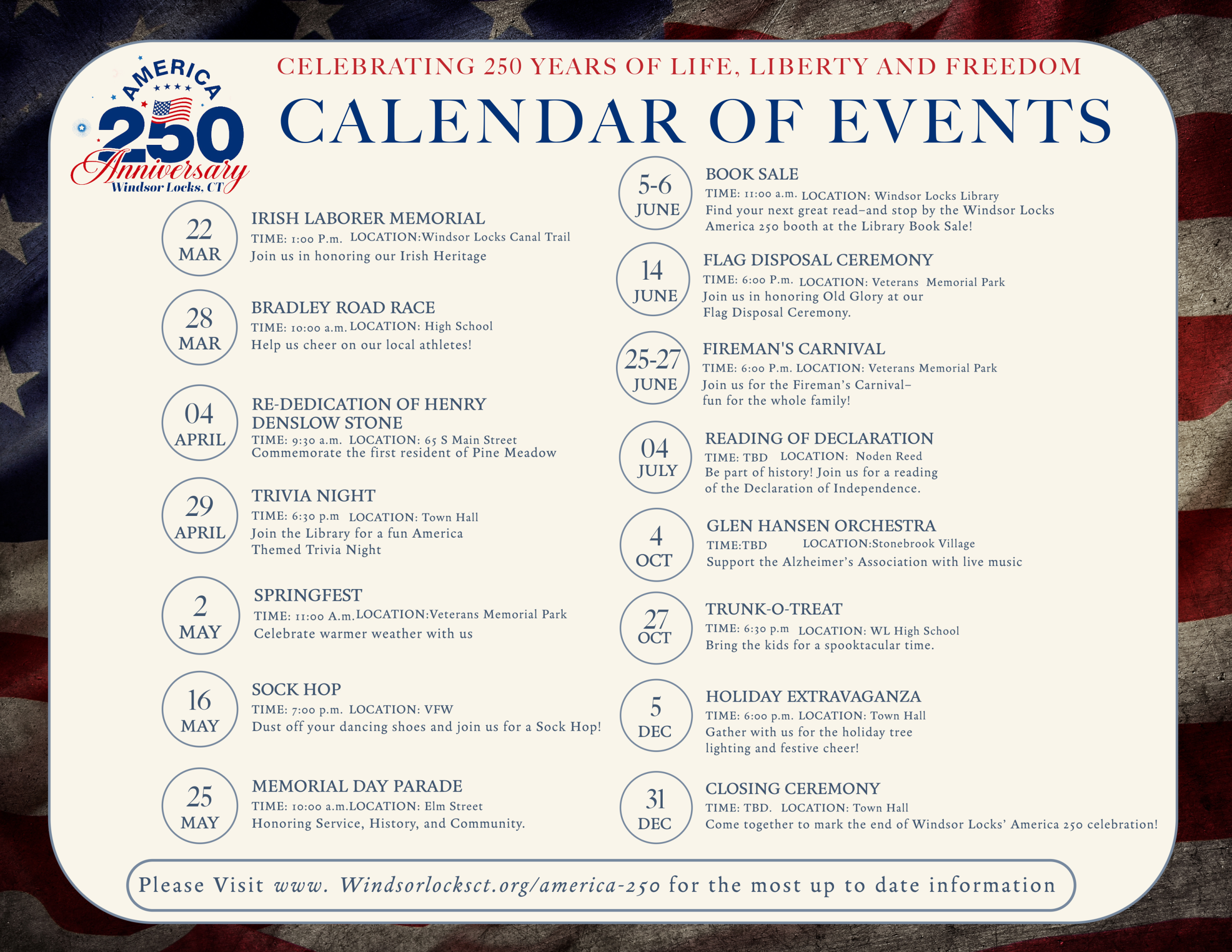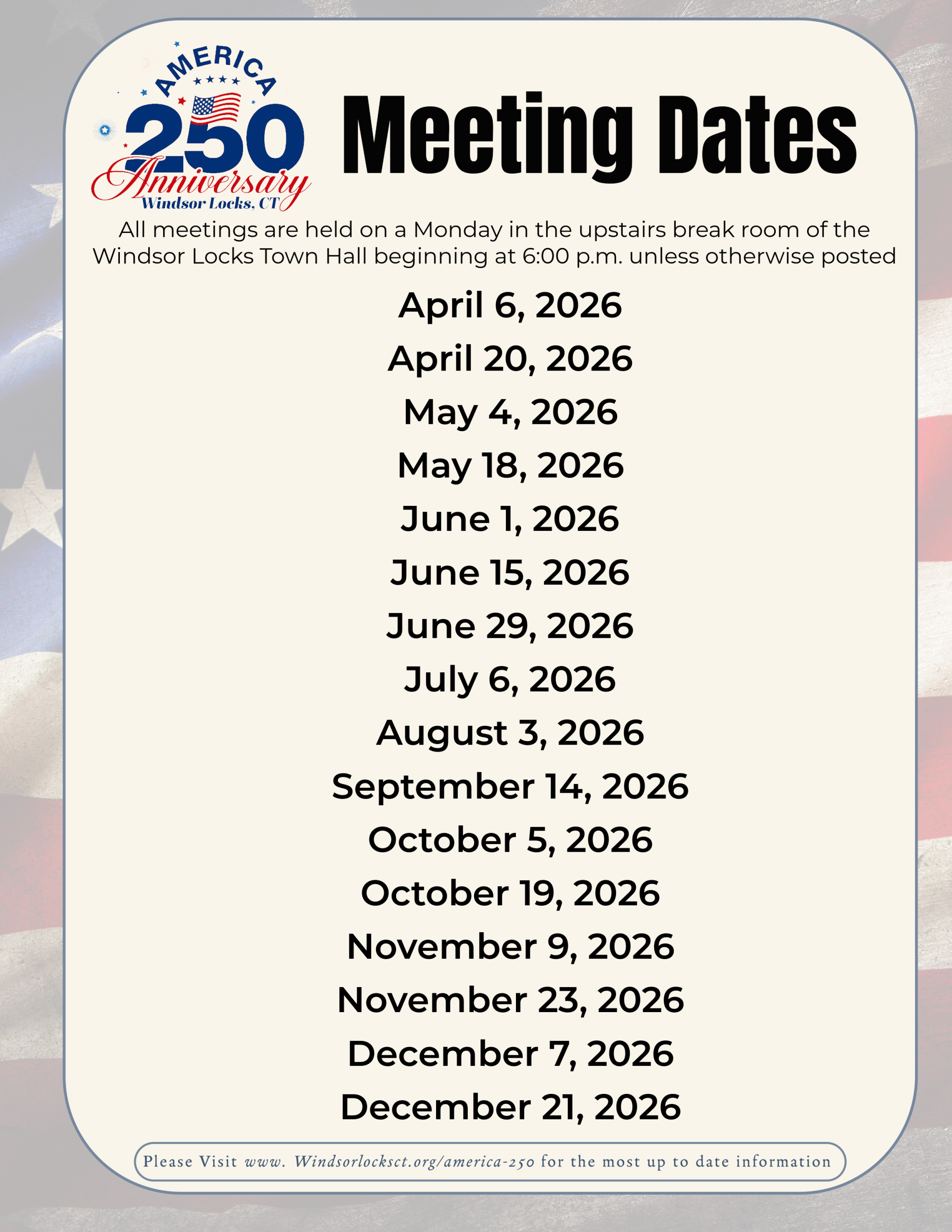 -Volunteer: contact [email protected] to help plan and run events, raise funds, promotion, or assist with setup and cleanup. Meeting dates are listed below. All are welcome to attend, share ideas, or present as we work together to celebrate Windsor Locks’ 250th Celebration.